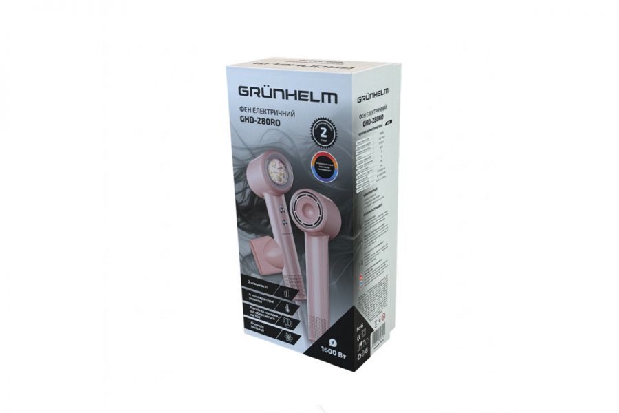 Головна перевага, за яку варто замовити Grunhelm GHD-280RO — це інтелектуальна система контролю температури. Фен Грюнхельм GHD 280 RO має 5 температурних режимів та 2 налаштування швидкості повітряного потоку, що дозволяє підібрати ідеальний цикл сушіння для будь-якого типу волосся. Функція іонізації знімає статичну електрику, роблячи локони слухняними, блискучими та гладкими. Якщо ви плануєте купити фен з іонізацією, модель GHD-280RO стане вашим фаворитом.
