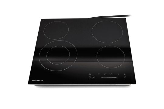 Grunhelm GPC 725 BE — лаконічна варильна поверхня, що виготовляється зі склокераміки. На ній знаходиться овальна зона нагріву. Чотири конфорки різної потужності, які чітко видно на фото в каталозі Венкон, позначені білими колами. Якщо купити варильну поверхню Grunhelm GPC 725 BE, господиня зможе готувати або розігрівати кілька страв. Тип нагрівання електричної панелі — hi-light.